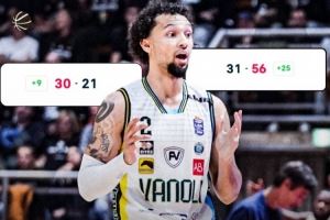 比赛中,克雷莫纳打出一波史诗级别的进攻高潮,第二节还剩7分05秒时,他们21-30落后博洛尼亚9分,在随后的10分半钟,他们打出一波35-1的进攻高潮。而在这次进攻高潮中,博洛尼亚这一分也是直到第三节7分35秒才拿到。