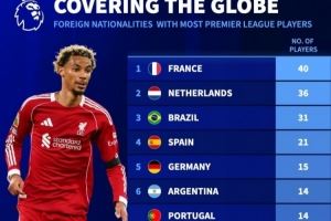 体育资讯10月27日讯 《转会市场》统计了当前英超的各国外援数量,法国球员多达40人。